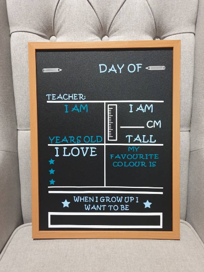 The timber framed black chalkboard can be written on with normal chalk sticks or chalk pen and easily wiped off. Great for use each year!!