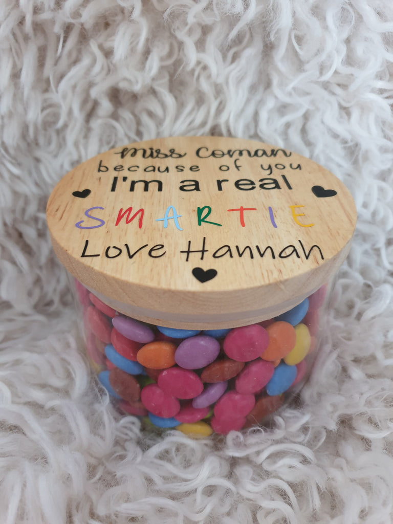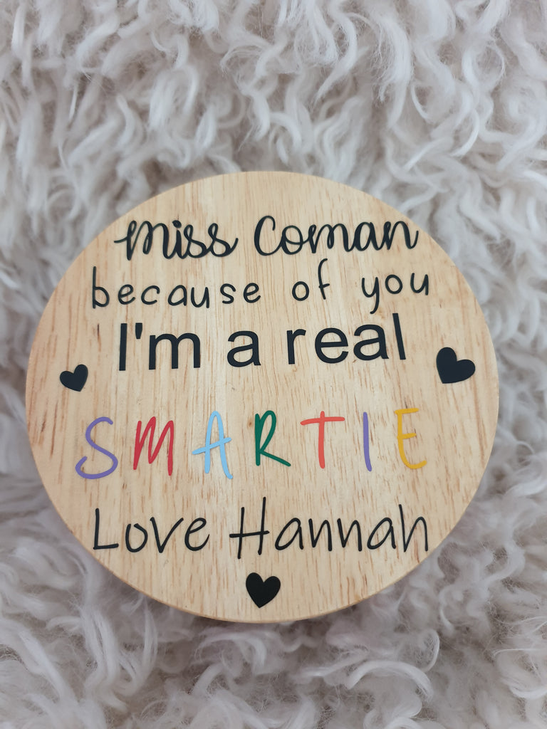 - Smarties = (Teacher name) because of you I'm a real SMARTIE. Love/from (name)