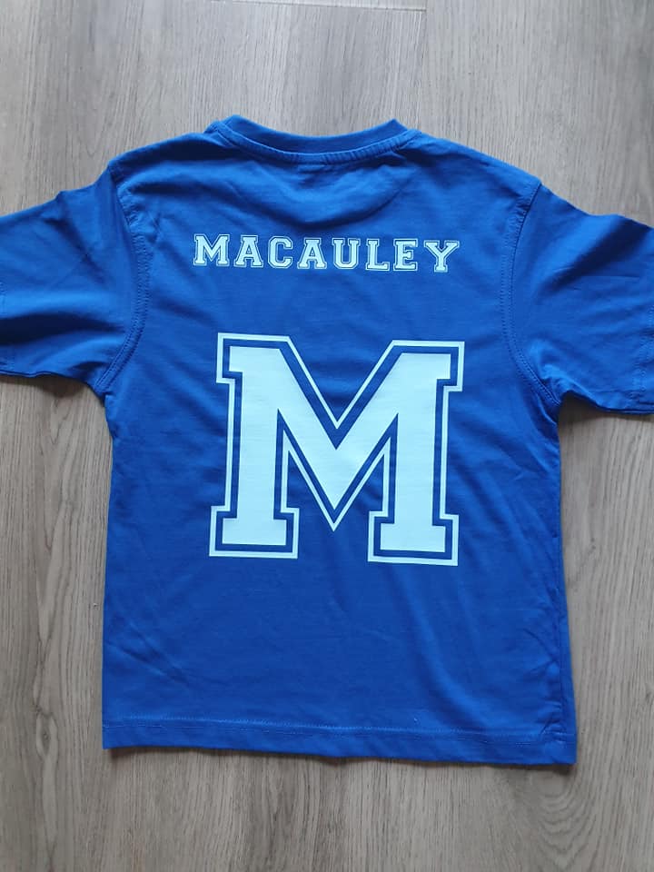 Then comes the fun part! Let your child stand out on the sports field by personalising with their name written on the back of the shirt! See photos as example of name placing. The large initial is not included in this new design. The shirt can also be left blank.